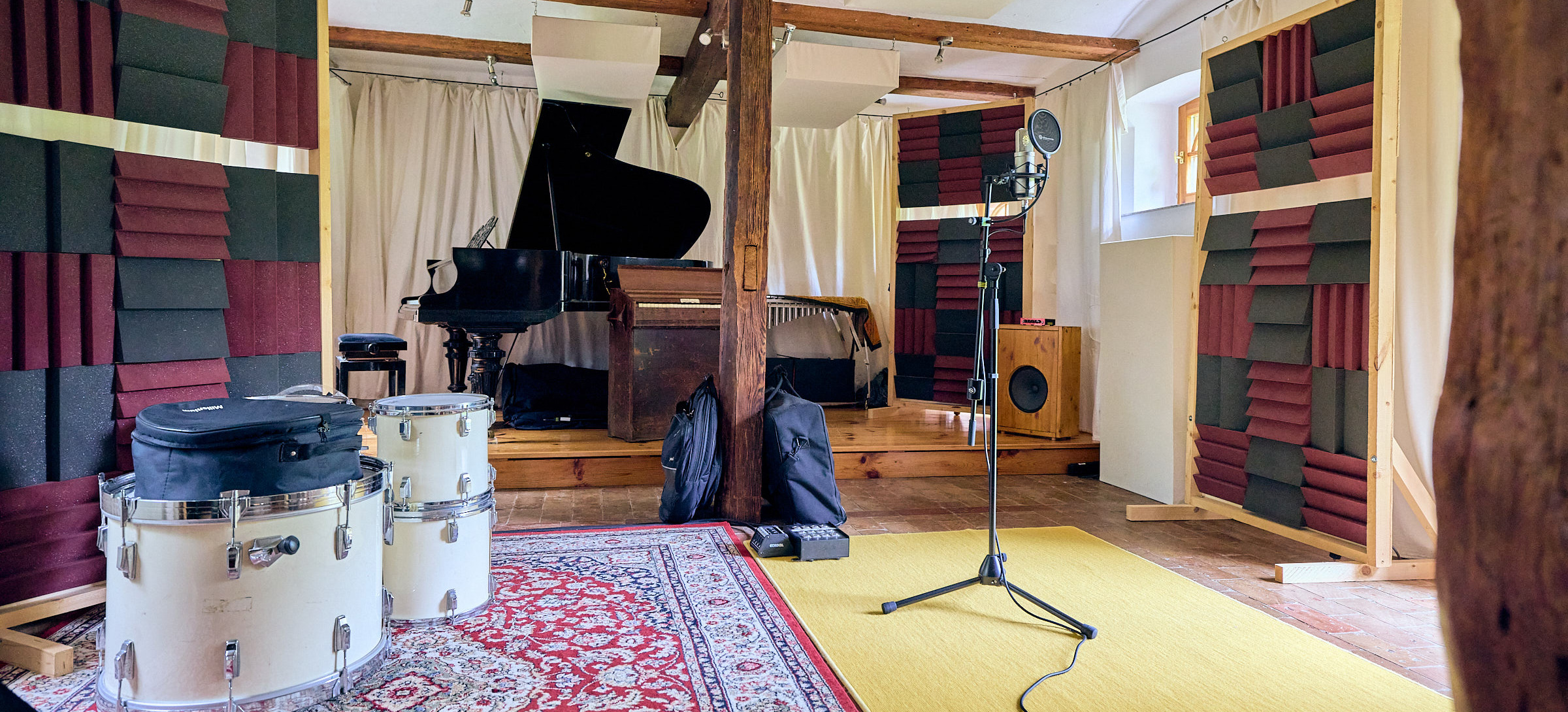 - Aufnahme-Equipment und Mikrofone zum Abnehmen von diversen Instrument inkl. Schlagzeug ist vorhanden